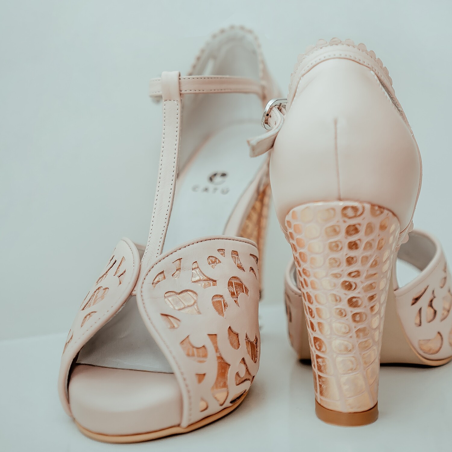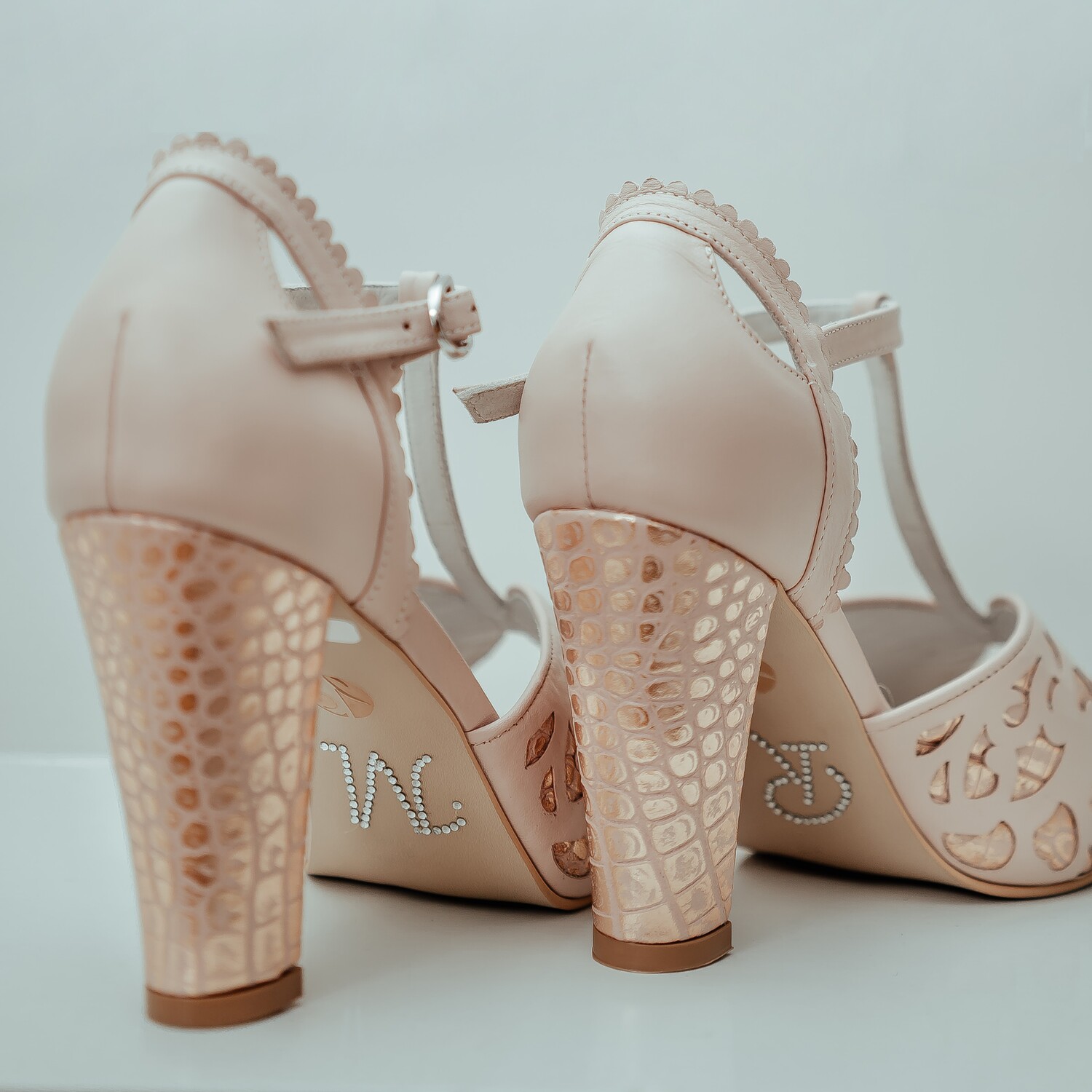 Zapato en cuero rosa con labrado rosa brillo y correa T. Plataforma de 1 cm.